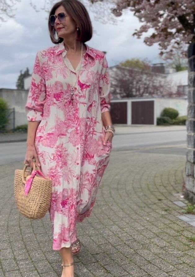 Sukienka z delikatnym kwiatowym wzorem: Styl wykonany z materiału w białych i różowych tonach będzie pasował wielu paniom. Krój może być różny – od klasycznej sukienki-koszuli po model w literę A.