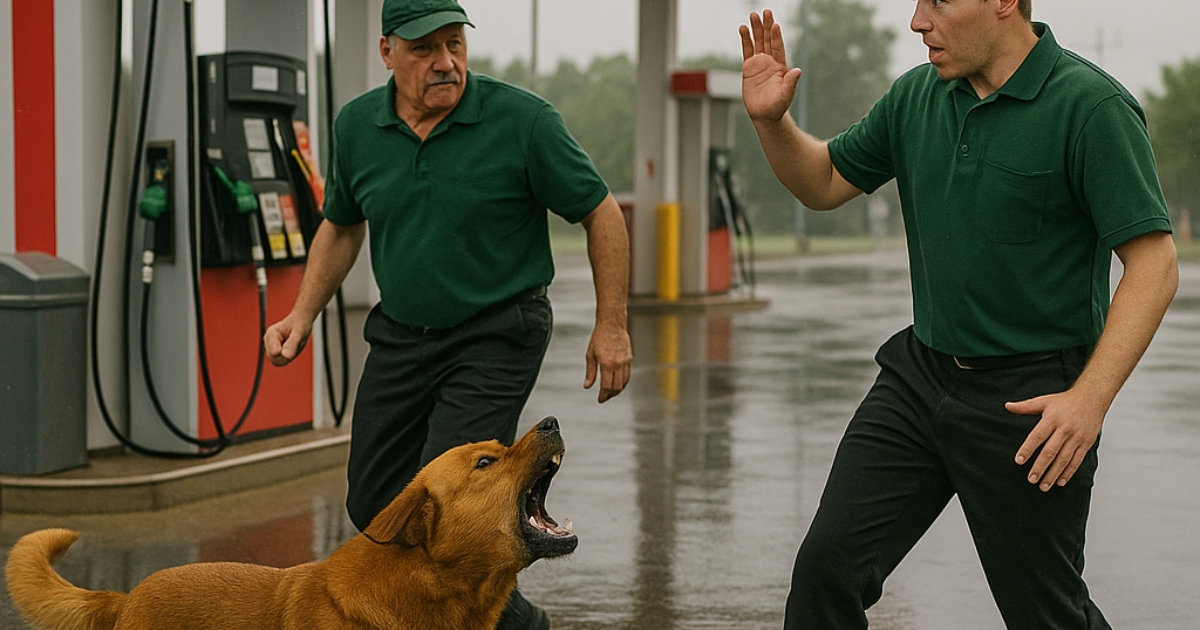 Nagle głośny szczek przerwał ich rozmowę. Odwrócili się i zobaczyli rudego psa stojącego na mokrym asfalcie tuż przy dystrybutorze, szczekającego uporczywie, jakby chciał im coś przekazać. Na początku wydawało się, że to zwykła uciążliwość bezpańskiego psa. Jednak w ciągu kilku sekund stało się jasne — coś było nie tak. Pies wpatrywał się prosto w nich. Kiedy podeszli bliżej, szczekanie stało się głośniejsze, a on ruszył w ich stronę. Jeden z mężczyzn odruchowo podniósł rękę, jakby chciał się bronić.