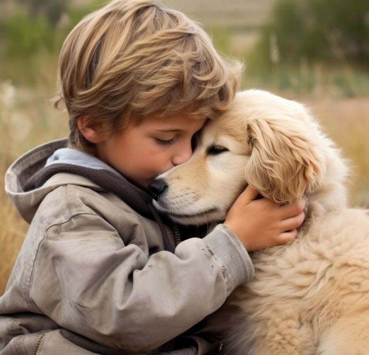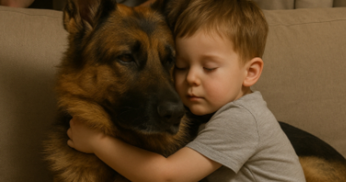 Trzyletni chłopiec nie zareagował. Przytulił się mocniej do ogromnego owczarka niemieckiego, wtulając twarz w jego gęstą sierść. Szare piżamowe spodnie w żółte autka zsunęły się na kolanach, a drobne rączki kurczowo trzymały psu szyję.