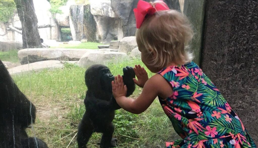 Mały goryl podszedł do niej i dotknął szybki swoją malutką rączką.