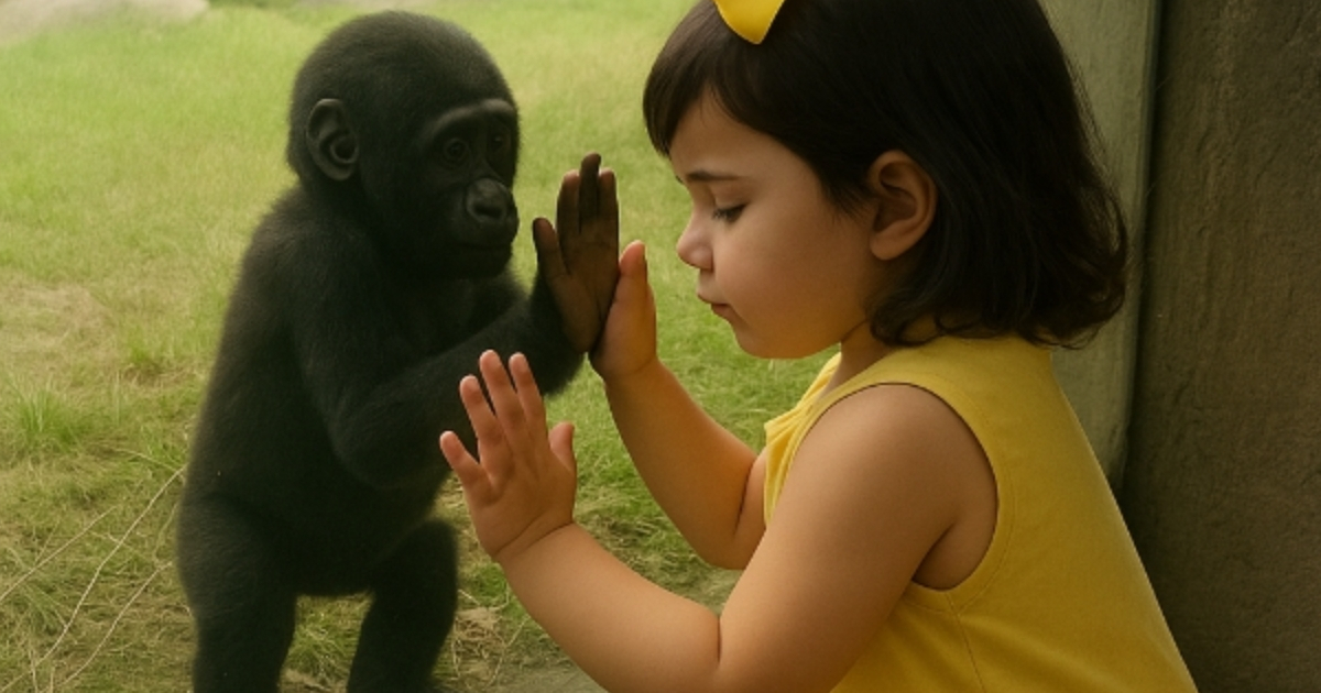 A chwilę później zza cienia wyszła matka-gorylica — ogromna, spokojna. Podeszła i objęła malucha, delikatnie odpychając go z powrotem do szyby, jakby mówiła: