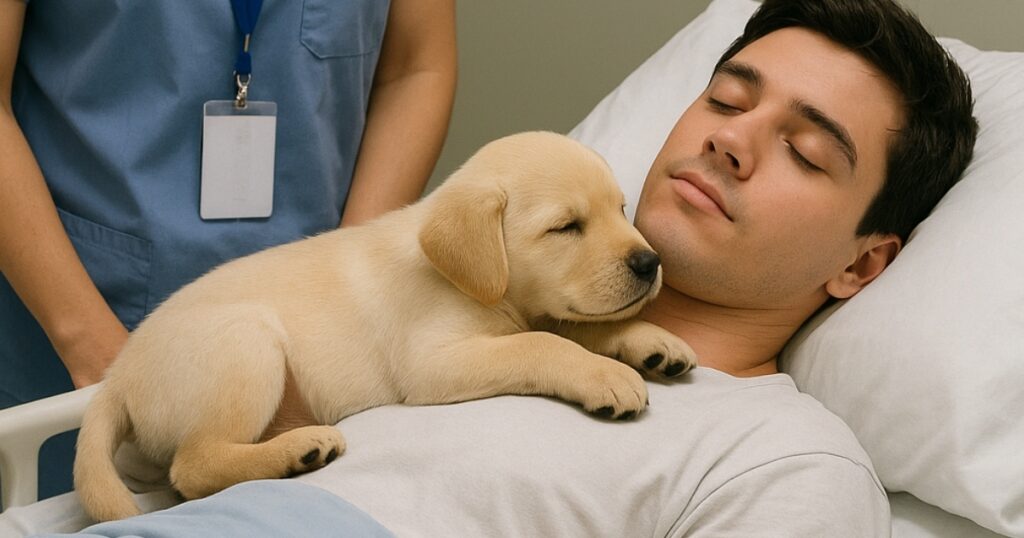Piesek wszedł powoli, z uszami przyciśniętymi do głowy, z oczami pełnymi bólu i nadziei. Okrążył łóżko, powąchał powietrze — jakby chciał się upewnić: to naprawdę on?