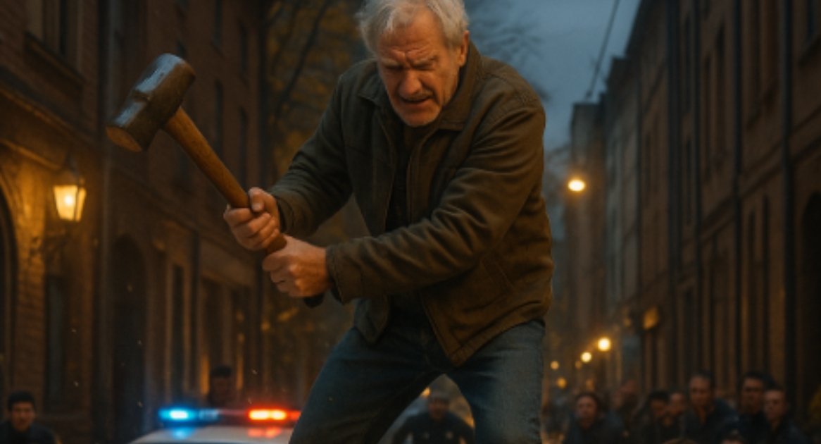 Na dachu białego furgonu stał starszy mężczyzna. W obu rękach trzymał ciężki młot i z każdym uderzeniem zamieniał samochód w stos zmiażdżonego żelaza. Metal jęczał, dach trzeszczał, szyby rozsypywały się, a z piersi mężczyzny wyrzucał się stłumiony krzyk — mieszanka bólu, rozpaczy i szaleństwa.
