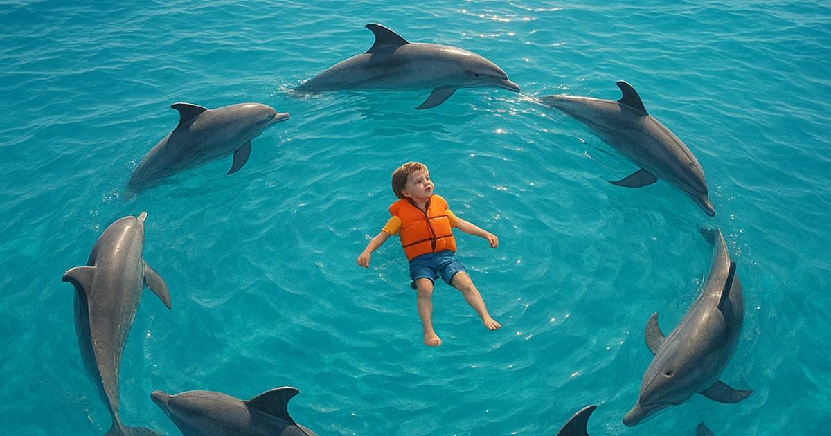 Zdezorientowany chłopiec chwycił się grzbietu jednego z delfinów, nie zdając sobie sprawy, że te zwierzęta dosłownie trzymają go przy życiu.