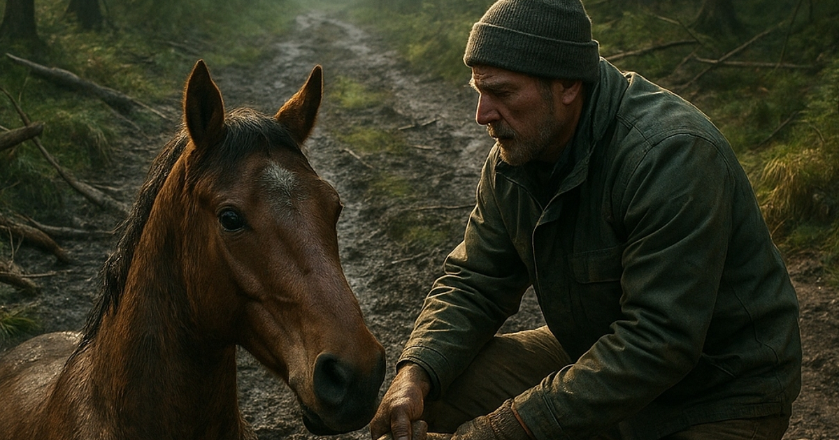 Silnik zawarczał — drzewo wreszcie ruszyło. Rzucił się do zwierzęcia, uwolnił nogę. Na skórze była głęboka rana, ale kość cała. Eliasz wyjął apteczkę, przemył ranę, opatrzył ją. Przez cały czas koń nie stawiał oporu — jakby rozumiał, że ratuje go człowiek. Gdy skończył, zwierzę podniosło głowę i cicho zadrżało — niemal szeptem, z ludzką wdzięcznością.