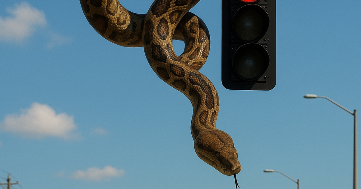 Jednak w następnym momencie „sznurka” zaczęła się poruszać. Powoli, w dziwnie żywym rytmie. Serce zabiło mu mocniej: to była wąż. Długi, oliwkowo-zielony, z lekko trójkątną, spłaszczoną głową. Ślizgał się prosto w kierunku pasa, na którym jechały samochody. Jej skóra jeżyła włosy, choć szyba i metal chroniły go przed zagrożeniem. Mrugnął, próbując przekonać siebie, że się myli: „To niemożliwe… nie jesteśmy w Teksasie ani w dżungli…” Ale wąż był prawdziwy. Żywy. Pewny każdego swojego ruchu.