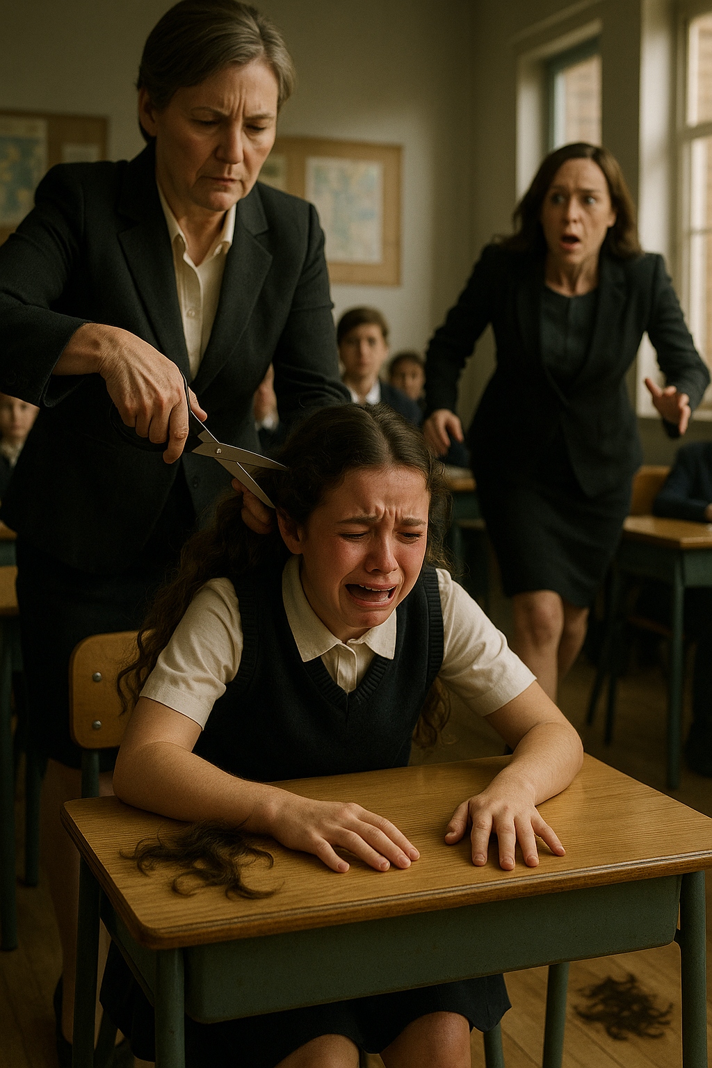 Bez namysłu, nauczycielka ucięła jej włosy, zostawiając nierówne kosmyki. Klasa zamarła w całkowitej ciszy. Jeden z kolegów nagrał scenę telefonem, a wideo szybko pojawiło się w internecie.