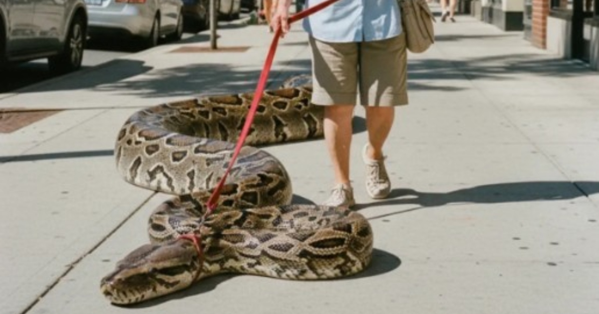 W środku dnia, na jednej z najbardziej ruchliwych ulic miasta, przechodnie natknęli się na widok, którego nigdy w życiu nie zapomną. 70-letnia emerytka spokojnie spacerowała ze swoim pupilem na smyczy. Jednak nie był to pies ani kot, lecz ogromny pyton powoli sunący po asfalcie. Ludzie wokół wpadli w panikę i zaczęli uciekać, a niektórzy wyciągnęli telefony, aby nagrać te niewiarygodne chwile.