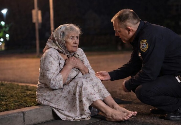 Gdy funkcjonariusz dotarł na miejsce, na pustej ulicy zobaczył tylko starszą kobietę w cienkiej koszuli nocnej, drżącą z zimna. Wtedy zrozumiał powagę sytuacji. Jej spojrzenie nie wyrażało dezorientacji — było to czyste przerażenie.