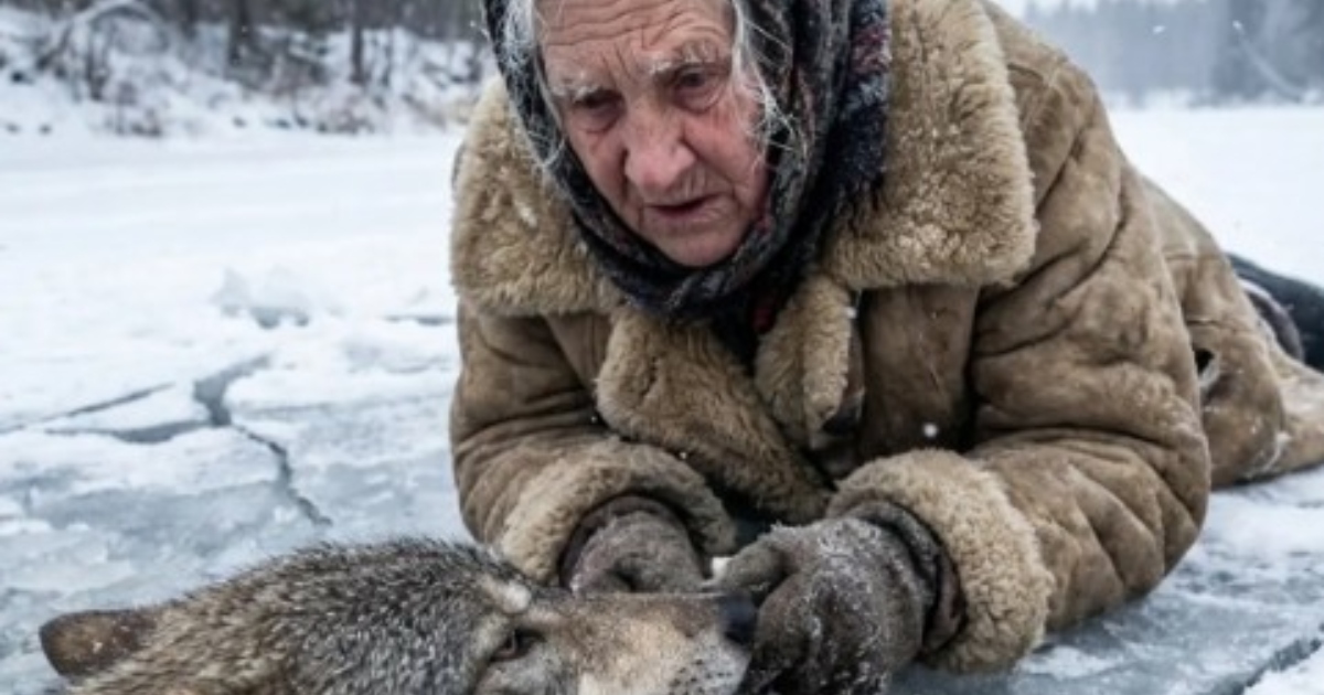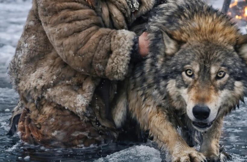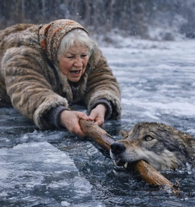 Był mroźny, zimowy dzień, a powierzchnia górskiego jeziora pokryta była cienką warstwą lodu. Starsza kobieta zbierała drewno, gdy dostrzegła ogromnego wilka, który desperacko wyrywał się w miejscu, gdzie lód się załamał. Jego pazury ślizgały się, a każdy ruch pogrążał go głębiej w lodowatej wodzie. Kobieta, nie zważając na dzikość zwierzęcia, położyła się na śniegu i wyciągnęła w jego stronę długi kij. Mimo trzasków pękającego lodu, nie poddała się i całym swym wysiłkiem wyciągnęła wyczerpanego wilka na brzeg.