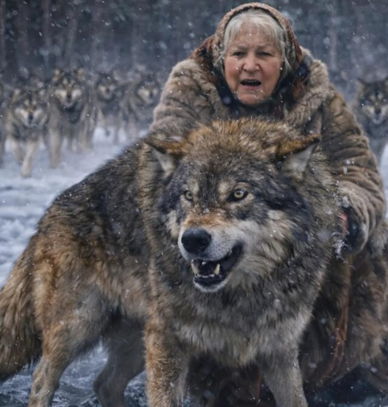 Wilk, mokry i drżący, leżał na lodzie, dysząc ciężko; jedno z jego tylnych nóg wyglądało, jakby było złamane. Kobieta, przygotowując się do odwrotu w strachu, nagle zauważyła ruch w głębi lasu. Spośród drzew wyłoniło się dziesięć par świecących oczu. To była wataha wilków. Zwierzęta poczuły obecność człowieka i szybko zbliżały się. Starsza kobieta, nie mając dokąd uciec, zamarła w przerażeniu.