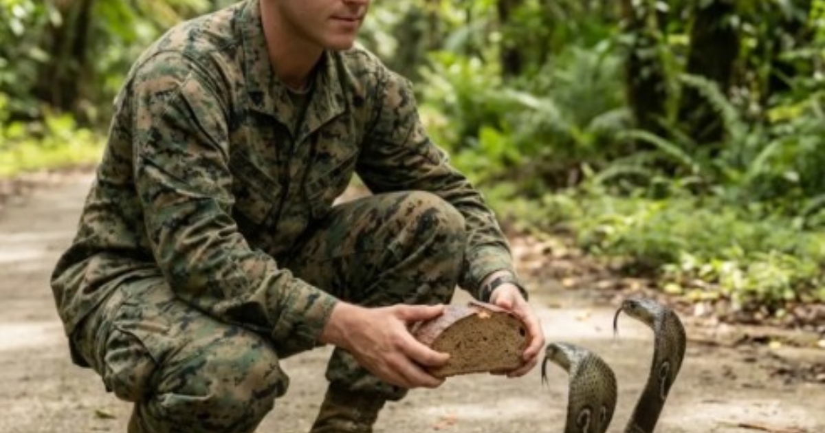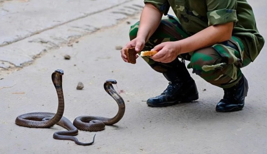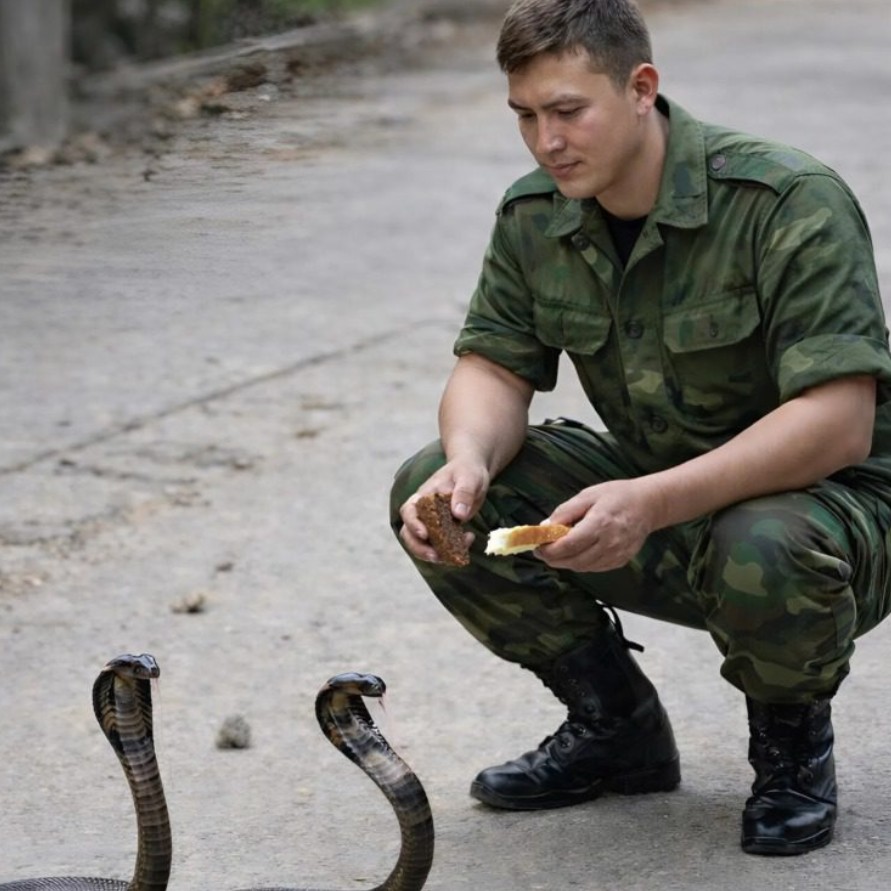 Młody żołnierz, kopiąc okop na skraju obozu, zauważył dwa małe węże przesuwające się spośród nagrzanych słońcem kamieni. Rozkazy wojskowe nakazywały natychmiastowe eliminowanie takich stworzeń w trosce o bezpieczeństwo personelu. Jednak młody mężczyzna nie miał serca wobec tych malutkich istot, które patrzyły na niego z ciekawością. Zamienił to niebezpieczne sąsiedztwo w sekretne zajęcie, codziennie dokarmiając je kawałkami chleba i mięsa. To ryzykowne hobby stało się jego małą tajemnicą i niewinną zabawą podczas nudnych dni w terenie.