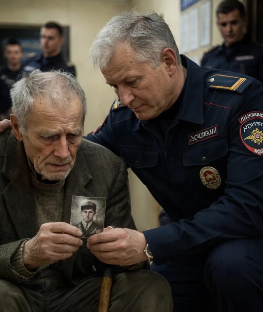 „To mój syn” — wyszeptał staruszek słabym głosem. Komendant, wyraźnie poruszony, ukląkł przed starym mężczyzną pośrodku korytarza. „Twój syn nas wtedy uratował. Osłonił nas własnym ciałem, żebyśmy my mogli przeżyć. Dziesięciu mężczyzn zawdzięcza mu życie, a ja jestem jednym z nich” — powiedział drżącym głosem. W całym wydziale zapadła grobowa cisza, a młodzi policjanci, którzy chwilę wcześniej się śmiali, spuścili zawstydzeni wzrok.