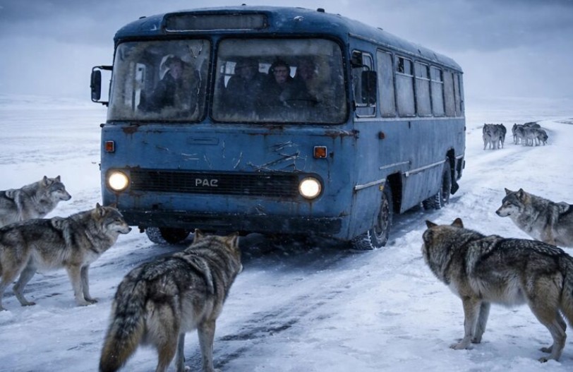 Podczas gdy zimowa burza szalała w najlepsze, autobus prowadzony przez doświadczonego pięćdziesięciolatka mozolnie sunął po zaśnieżonej drodze. Pasażerowie z niepokojem obserwowali biel kryjącą się za lodowymi wzorami na szybach, gdy nagle pojazd zwolnił. Kierowca zmrużył oczy, a jego dłonie zacisnęły się mocniej na kierownicy. Z zaśnieżonej zasłony najpierw wyłoniła się jedna, potem pięć, a wkrótce dziesiątki szarych sylwetek. To nie były zwykłe psy, lecz ogromne stado wilków. Gdy autobus się zatrzymał, ogarnął wszystkich lodowaty strach; dzikie zwierzęta otoczyły pojazd w ciszy, po prostu czekając.