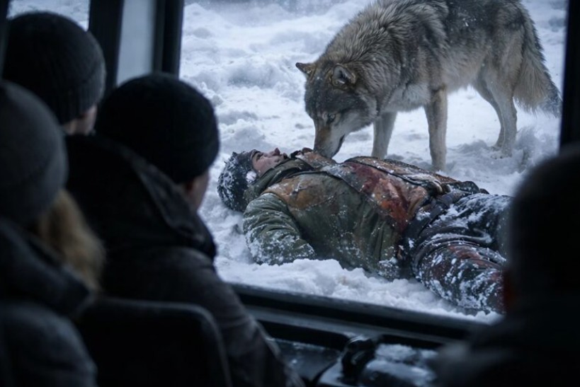 Pasażerowie w panice krzyczeli o zamknięte drzwi, ale dziwne zachowanie wilków przyciągnęło ich uwagę. Nie warczały ani nie uderzały w szyby; zdawały się stać nieruchomo, jakby wskazywały coś istotnego. Kierowca przetarł przednią szybę i dostrzegł, że wzrok wilków nie skierowany jest na autobus, lecz na zaspy śniegu przy drodze. Gdy wiatr na chwilę ustał, pod śniegiem ujawniła się sylwetka nieruchomego człowieka.