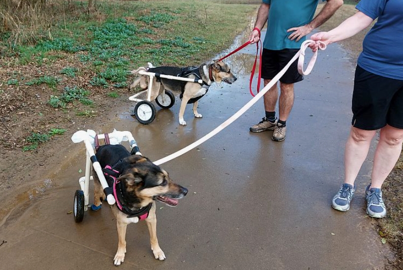 Nasz ogród szybko zamienił się w prowizoryczne laboratorium, gdzie Ethan zbierał stare części rowerów, koła od wózków dziecięcych i rury PVC, tworząc z nich własnoręcznie dopasowane wózki mobilności. Z cichą determinacją i niezwykłą cierpliwością budował wózki, które pozwalały psom znów się poruszać i odzyskiwać choć część wolności. Widok ich pierwszych przejazdów na kółkach wniósł do naszego domu radość, której brakowało nam od dawna. Ethan jednak nie przestał — przeznaczył wszystkie swoje oszczędności, aby zbudować solidne, ocieplone schronienie, dając psom miejsce, które mogły nazwać domem.