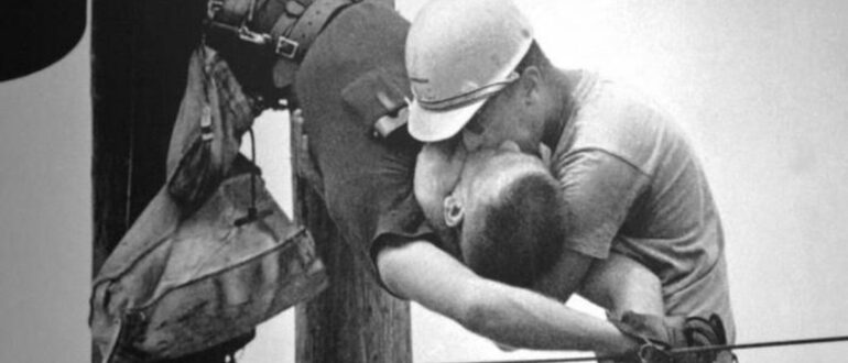 To zdjęcie stanowi niezwykły i poruszający moment uwieczniony w annałach fotografii. Przedstawia scenę pilności i heroizmu, gdy jeden mężczyzna udziela resuscytacji swojemu porażonemu prądem koledze, wysoko na szczycie